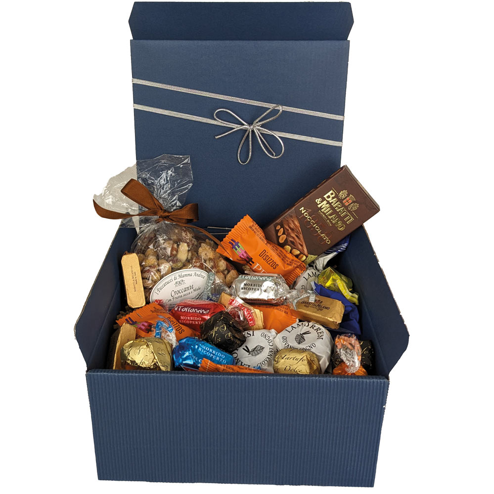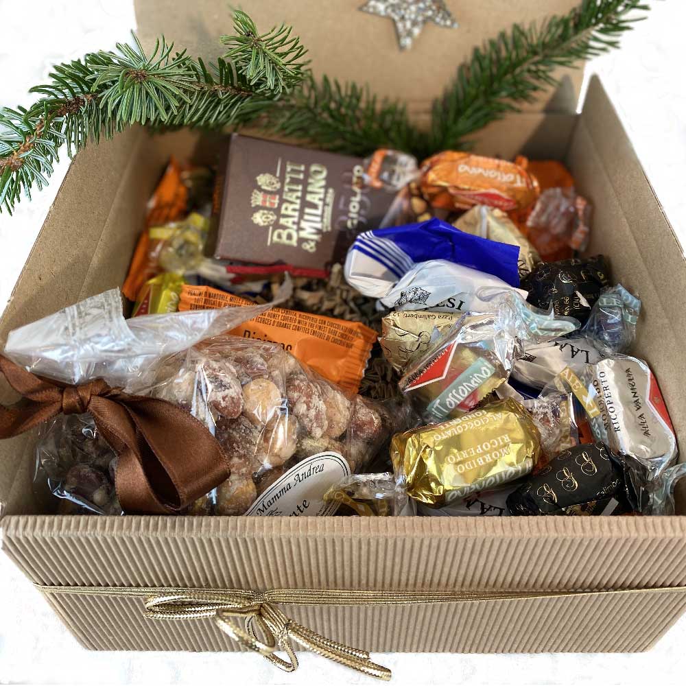Das ist nicht nur eine bunte Tüte, sondern gleich eine ganze Kiste voll mit ausgesuchten italienischen Süßigkeiten aus der Weihnachts-Fattoria
